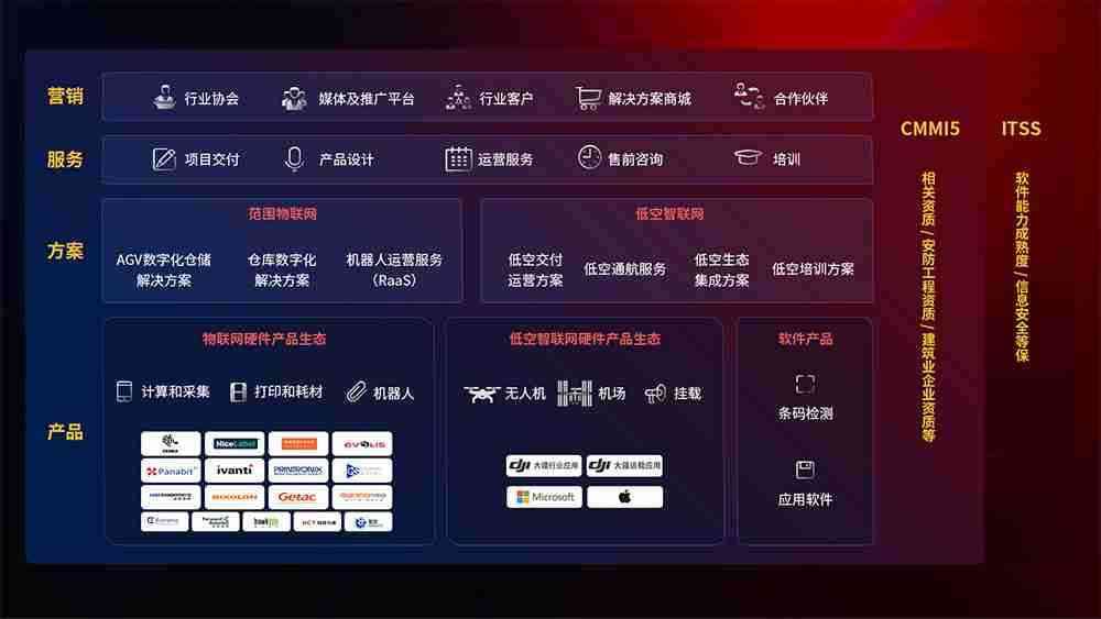 聚合国内外先进的物联网硬件产品品牌,,,聚焦数字化仓储、、、机器人运营、、、低空智联网等领域,,,,共同打造适合客户业务场景的解决方案并提供交付服务